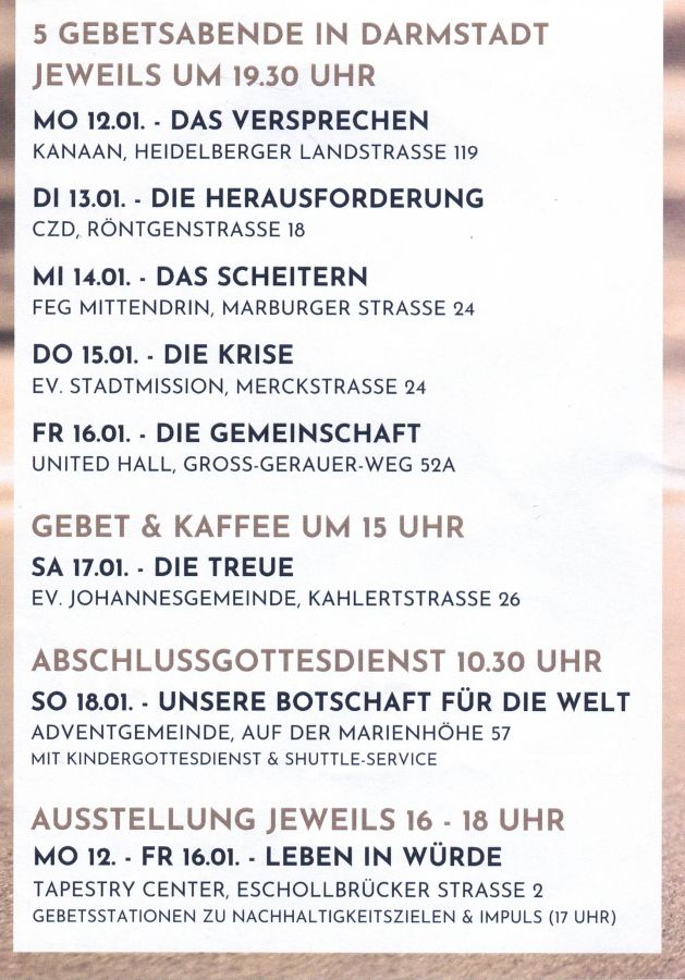 Seid dabei und kommt gemeinsam mit anderen Christen vor unseren treuen Gott, um für die Anliegen der Menschen in Darmstadt und der Welt einzutreten!